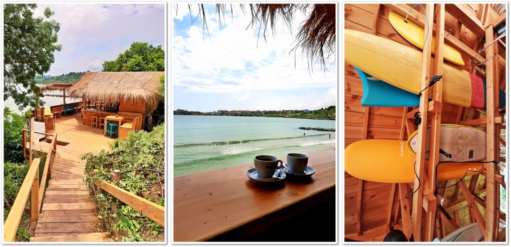 Почти всеки ден – дали рано сутрин, или под нощното небе, се разхождахме и до по-централните части на Царево. Между кв. Василико и центъра се простира дълга крайморска алея за пешеходци и колоездачи. Обикновено ми отнемаше около половин час, за да я премина, тъй като често спирах, за да съзерцавам хоризонта над синьото море. Но принципно едва ли би отнело повече от 10 минути. И така – по време на първата си подобна разходка, забелязах едно приказно барче – Django Surf & Bar. Изградено от дърво и слама, сгушено между дърветата и гледащо към морето, то светкавично прикова вниманието ми. Оказа се, че освен със страхотните си външен вид и атмосфера то привлича своите посетители и със стълбите си, които водят директно към плаж „Понтона“. Още щом влязох в бара, впечатление ми направиха прикачените към тавана сърфове. Първоначално реших, че са просто част от интериора. Но всъщност при благоприятни атмосферни условия „Понтона“ е перфектен за любителите сърфа и бодиборда, така че уж декоративните елементи от бара често влизат и в употреба. Що се отнася до самия плаж – той е сравнително малък, но по-голям от този при църквата, водата беше кристална, но бурна, а пясъкът – фин и приятен.