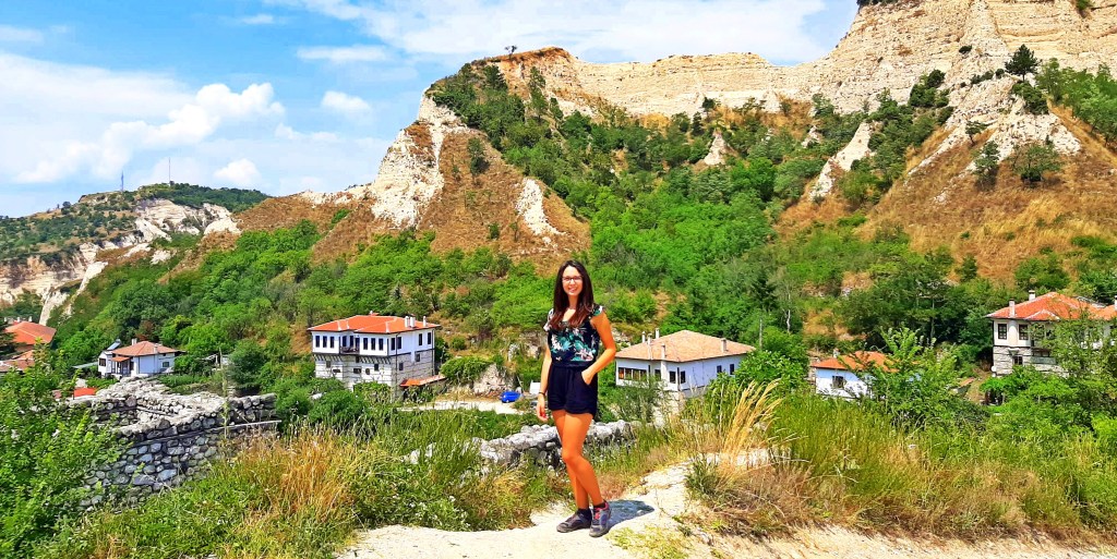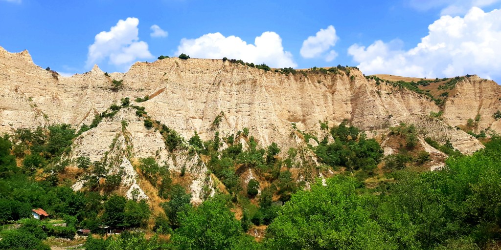 Мелнишките скални пирамиди, зелени дървета, старинни къщи