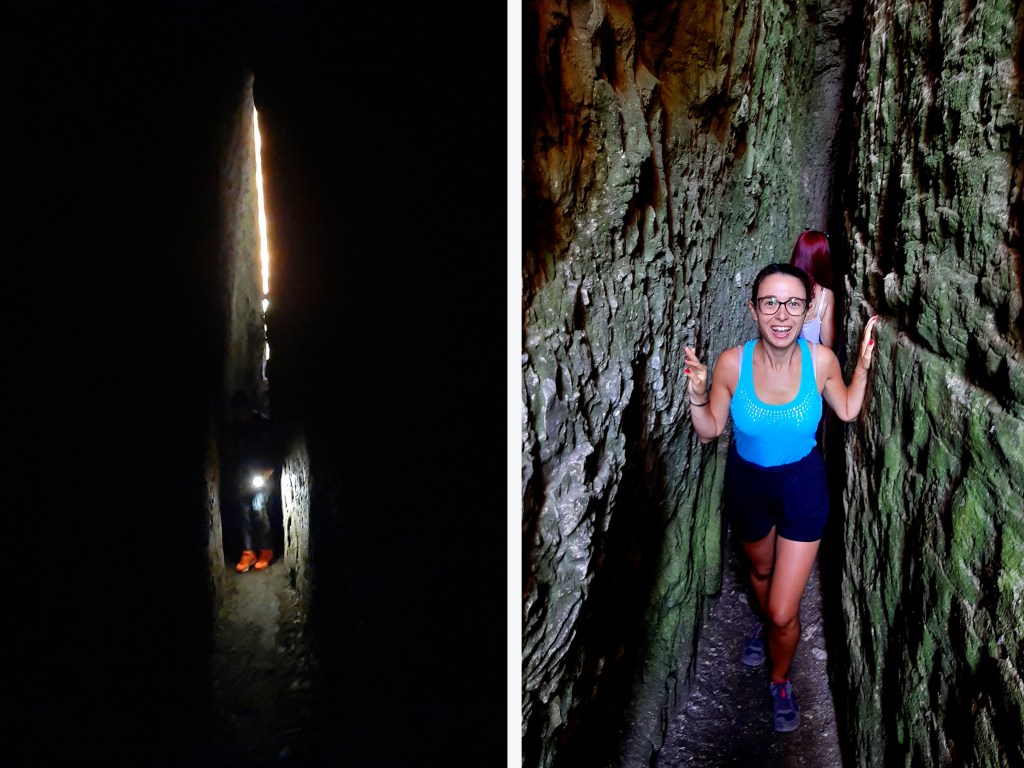 Скоро след това прекрачихме прага на най-интересната забележителност (поне според мен) в каньона – пещера „Темната дупка“ (не тази до с. Лакатник). Тя не беше много голяма, но затова пък беше доста по-различна от повечето пещери, в които съм влизала. Входът й водеше към изключително тесен и наклонен надолу коридор, който се простираше до самата сърцевина. Бе стръмно, мокро и хлъзгаво, така че слизането надолу имаше лек екстремен привкус.