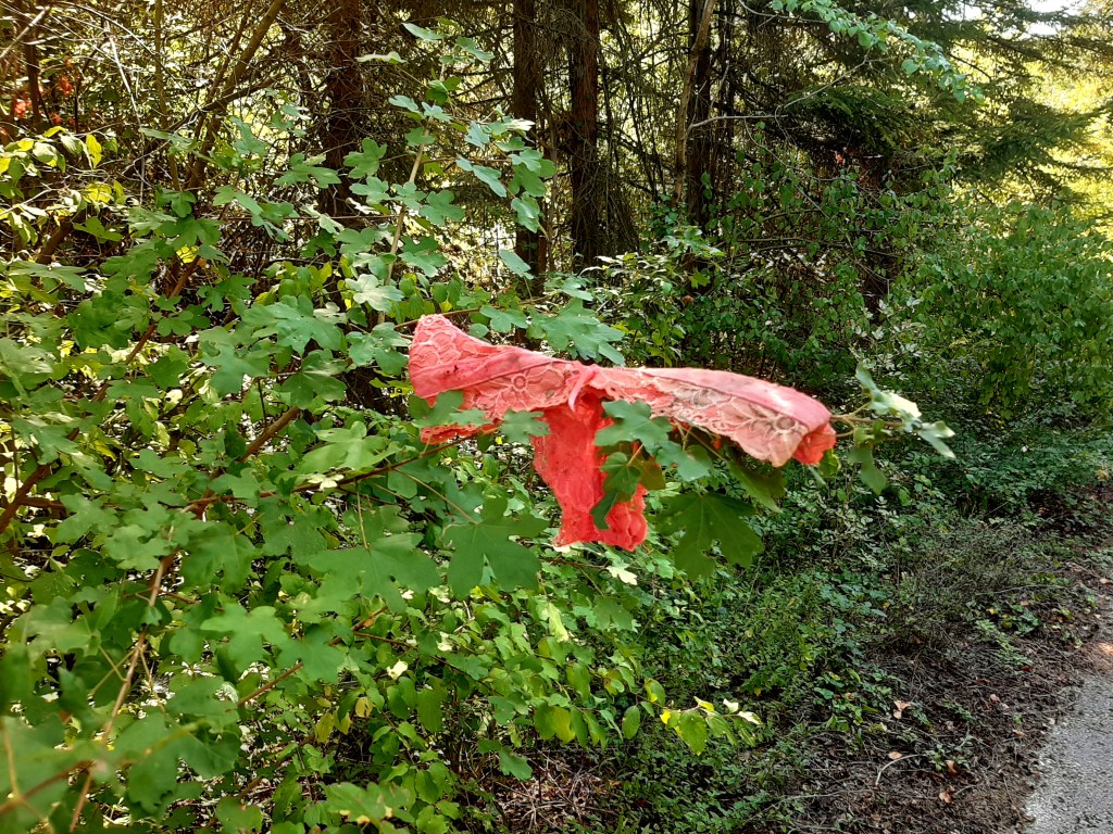 Последва слизане надолу по друг малко по-кратък път. Щом стигнахме по-полегатата и асфалтирана част от трасето, изведнъж бикините, закачени по храстите, се превърнаха в постоянно явление. На всеки няколко крачки виждахме нов модел. За причината за този местен „обичай“ можем само да гадаем.