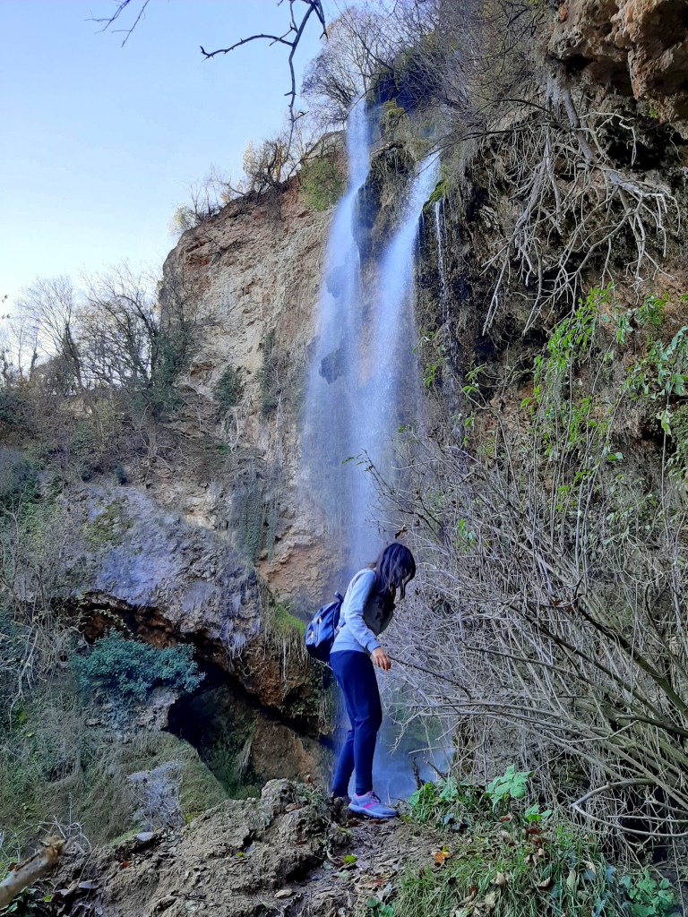 След като минахме къса кална пътечка (много е мокро, така че обувките ви освен стабилни трябва да бъдат и непромокаеми), пък се озовахме в нещо като пещера зад водопада. Но не под основния воден поток, а малко по-встрани. Ала и така си беше страхотно. Оттам съзрях и църквичката над водопада – нашата трета цел.