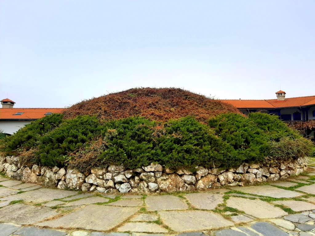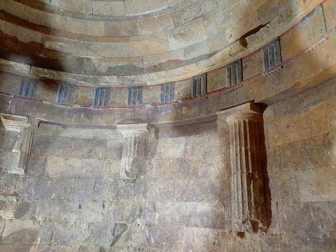 Тракийската гробница се оказа обградена с чуден зелен двор. Тук не се плаща вход, така че бързо поехме по симпатичната пътечка, която ни отведе до целта – единственият в Тракия храм с колонада от 10 на брой колони.