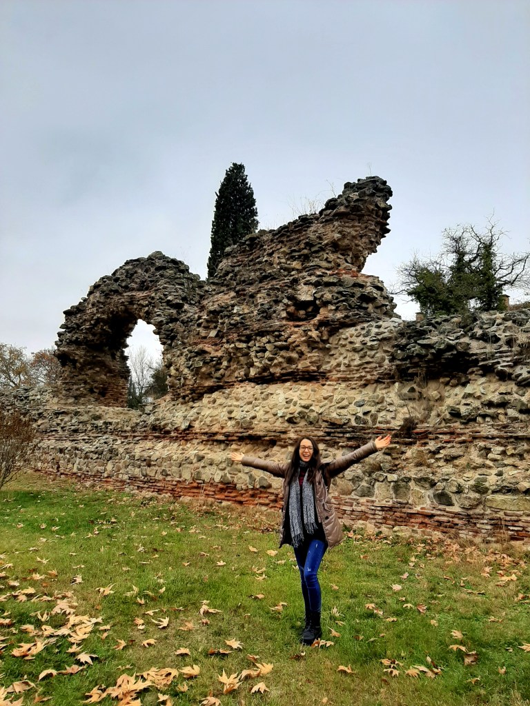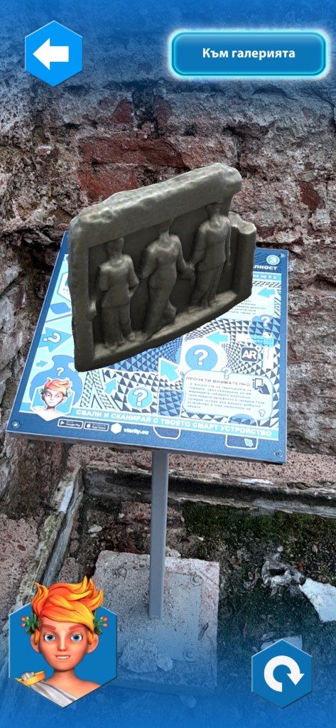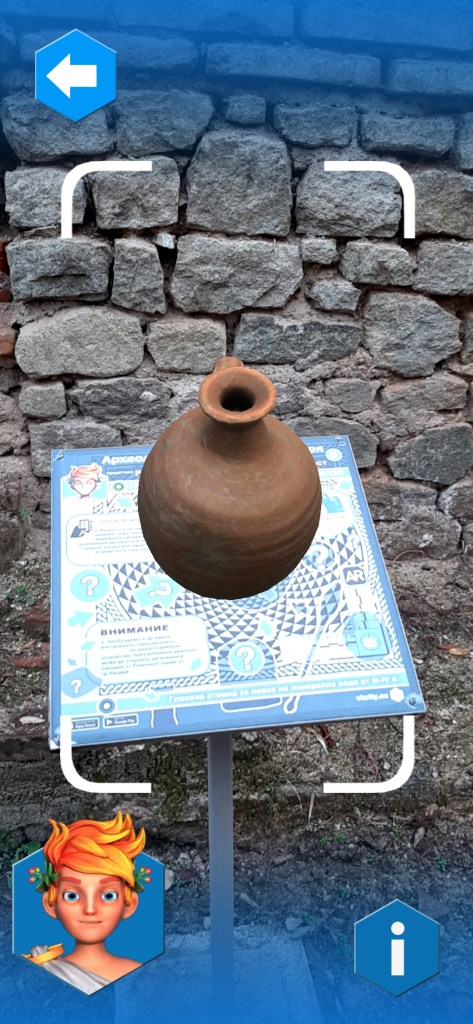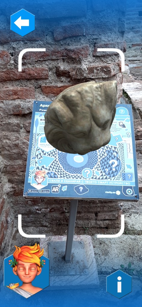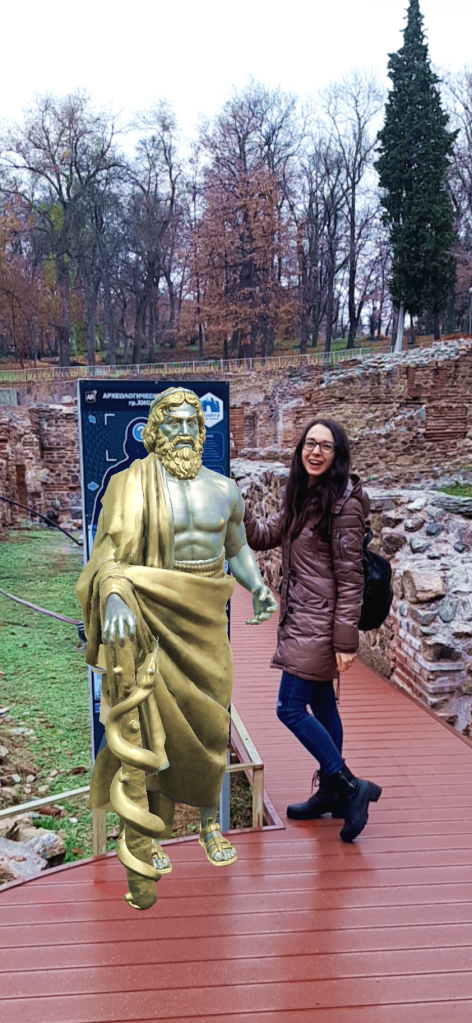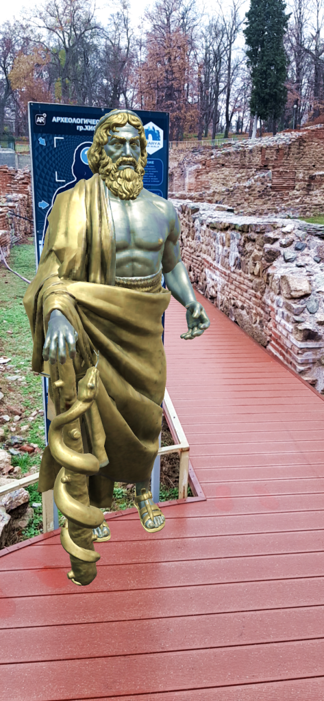 Още на входа на римските бани ще ви посрещне не кой да е, а върховният бог на здравето Асклепий. Можете дори да се снимате с него. Но за да го видите, трябва да насочите телефона си с активираното приложение към синята обозначителна табела. А ето ме и мен с бога на здравето. Надявам се да ми е донесъл здраве за цялата година напред, а и след това. 🙂