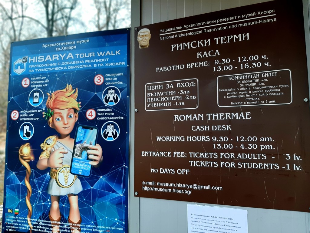 Римските терми са обособени в музей на открито с добавена реалност. Това е място, което би впечатлило всяко дете, а ако съдя по себе си и компанията ми – и по-порасналите хора. За да се потопите безпроблемно в това както модерно, така и антично преживяване, се съобразете с работното време – всеки ден от 9:30 ч. до 16:30 ч. с обедна почивка между 12:00 ч. и 13:00 ч., и се подгответе със заредена батерия на смартфона си. Цената на билетите е почти символична: за възрастни – 3 лв.; пенсионери – 2 лв.; учащи – 1 лв. Предлагат се и екскурзоводски беседи, но не мисля, че ще са ви необходими, ако имате смартфон.