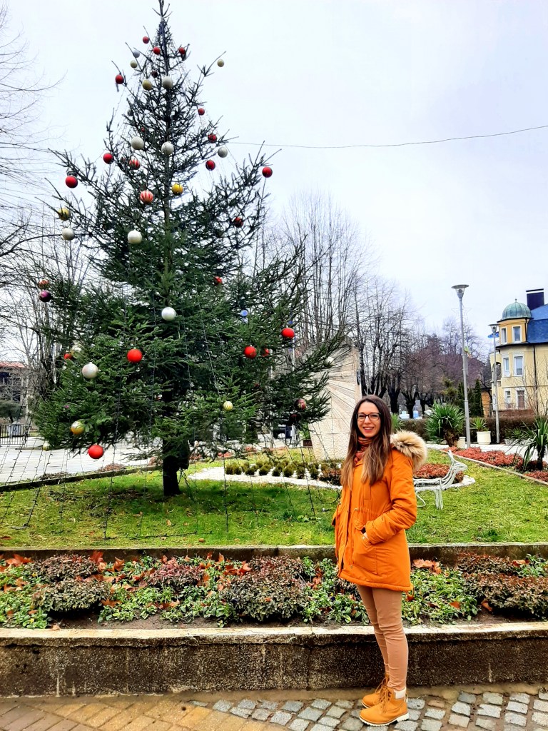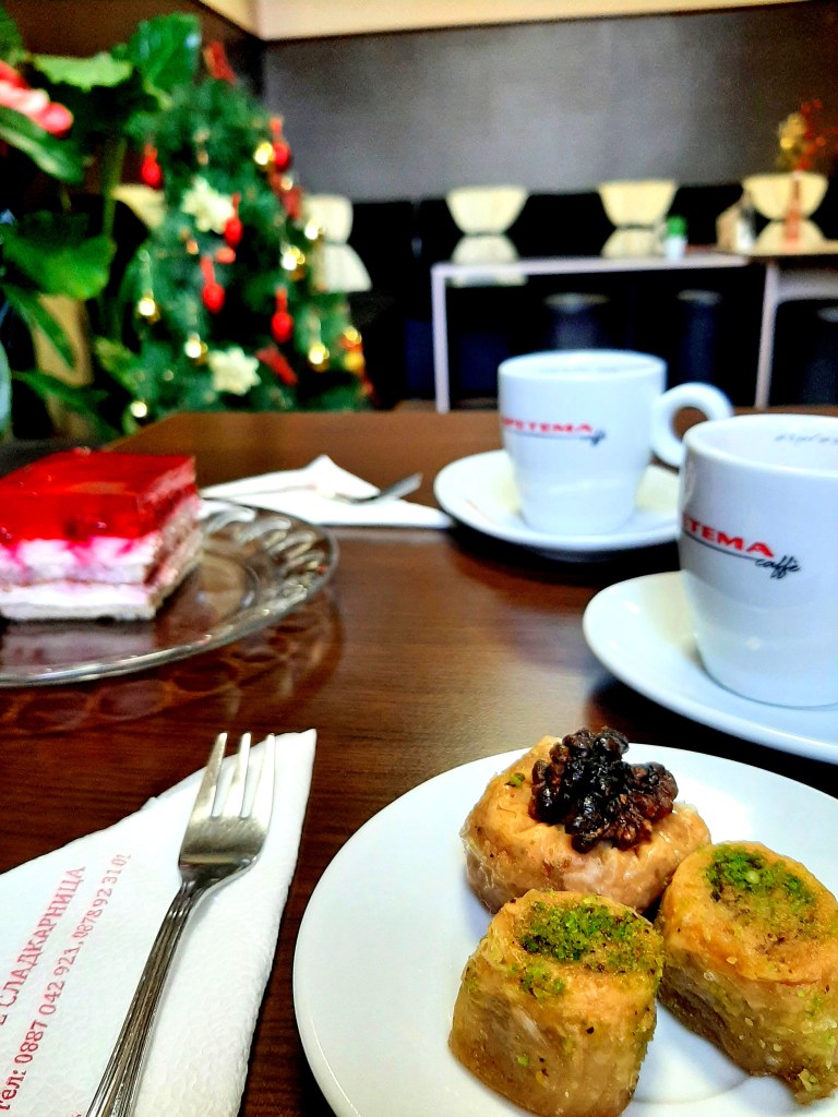 Навръщане видяхме много приятно местенце, наречено “Пекарна Мандра” с розови масички и елха, покрита с коледни играчки мъфини. Прииска ни се да изпием там следобедното си кафе с по някой сладкиш, но беше затворено – красотите гледахме през прозореца. Затова пък сладкарката отсреща ни прие с добре дошли. Добавям и снимка от коледната елха на Вършец за още по-празнично настроение.