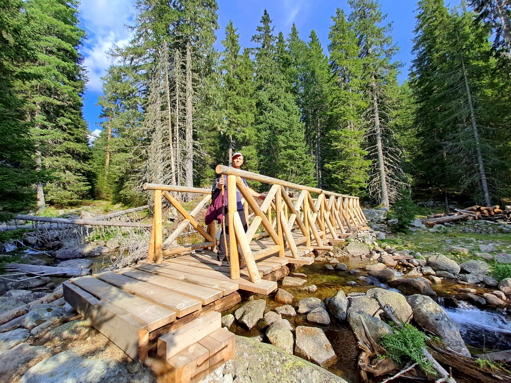 Сравнително в началото на пътя – след около 30 минути вървене, минахме през местността Даков мост. Дори и да не се чувствате готови за преход до Тевното езеро, ви препоръчвам да се разходите поне дотук. Поляната край реката е чудесна за пикник. Има си и истински дървен мост. 😀