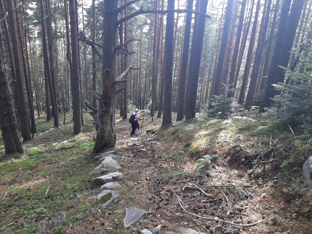 В един момент маркировката изчезна. Последва неподдържана и осеяна с хлъзгави шишарки пътека, но пък спестяваща много път. 😁 От самия заслон до Попина Лъка стигнахме за час и половина.