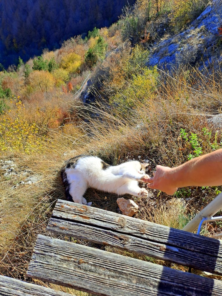 Тогава впечатление ни направи и гледката пред нея. Първоначално ни привлече едно много сладко и гушкаво коте, излегнало се точно на ръба на хълмчето. Зад него обаче се ширеше нещо още по-великолепно – омайна родопска гледка. 💚