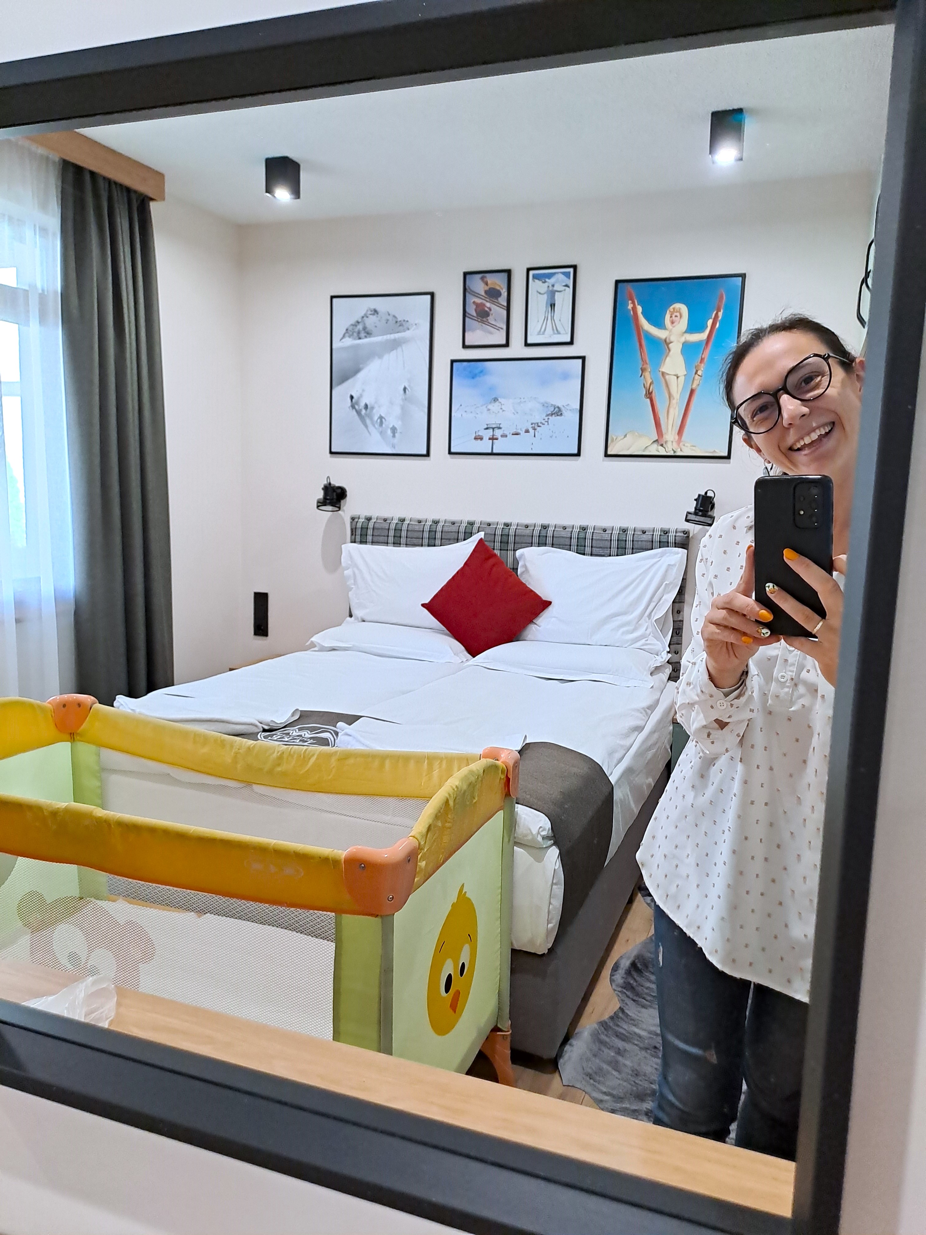 Влюбих се и във верандата, от която се слизаше директно на двора. Също и в спалнята с блекаут завеси, изключително удобен матрак и възглавници с мемори пяна. Много харесах и цялостния дизайн на помещенията – особено снимките по стените. Изкуство не липсваше дори в банята. Накратко – апартаментът ни беше уютен, удобен и перфектен за почивка с бебе. Имаше и детска кошара, въпреки че ние си носехме наша.