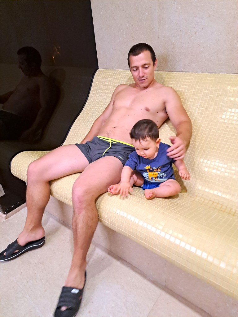 За чудесното ни прекарване помогнаха още СПА центърът и ресторантът. Макар и с бебе, успяхме да им се насладим. В СПА-то се редувахме – единият оставаше на релакс леглото (аз по-скоро бих го нарекла пейка) или край басейна с Марти (той се влюби в люлките там), докато другият се отдаваше на няколко мига спокойствие в сгряващите душата инфраред сауна, финландска сауна, арома парна баня и римска парна баня. Имаше още приключенски душ и студено ведро, но от тях се възползва само Филип.